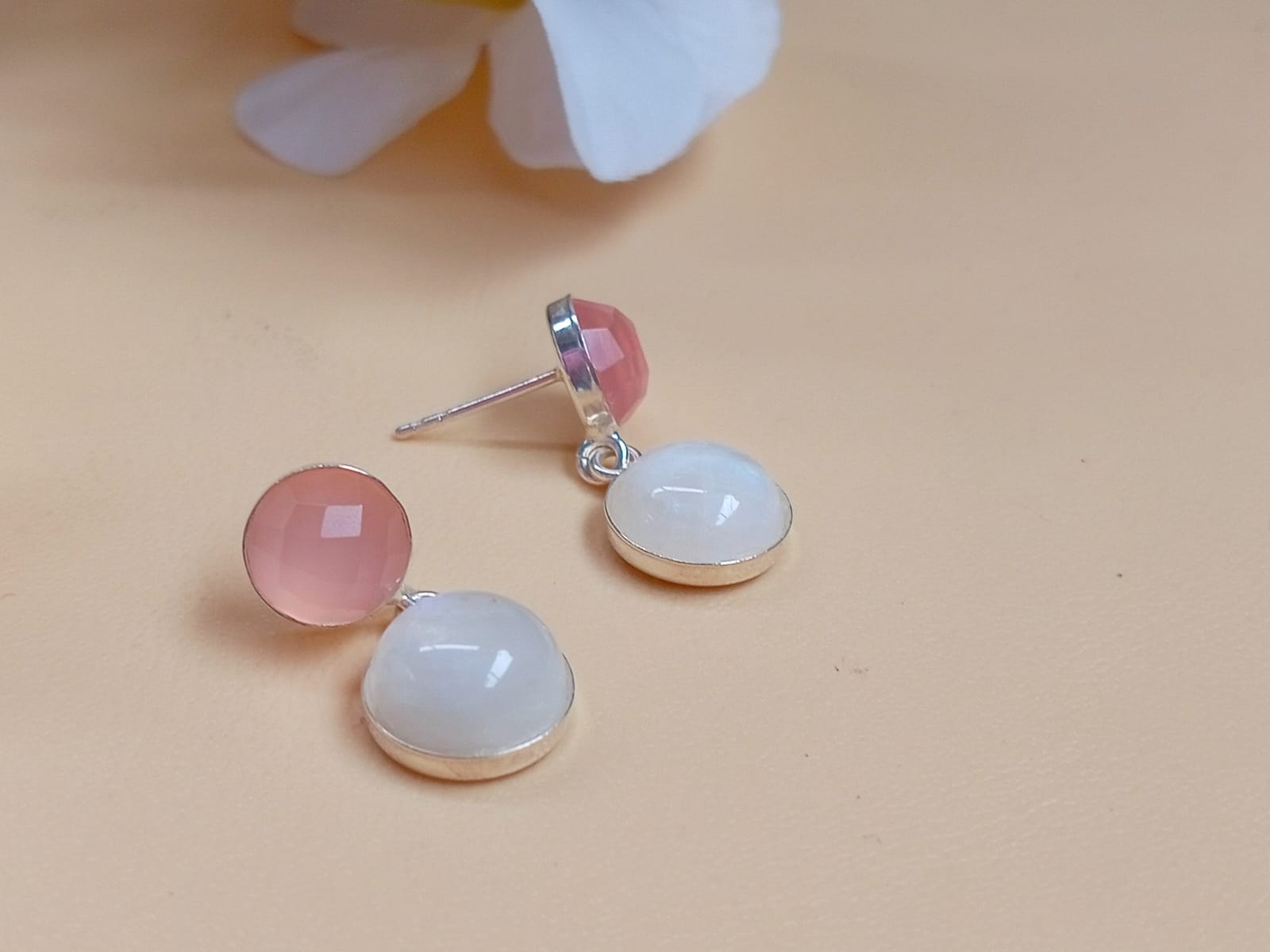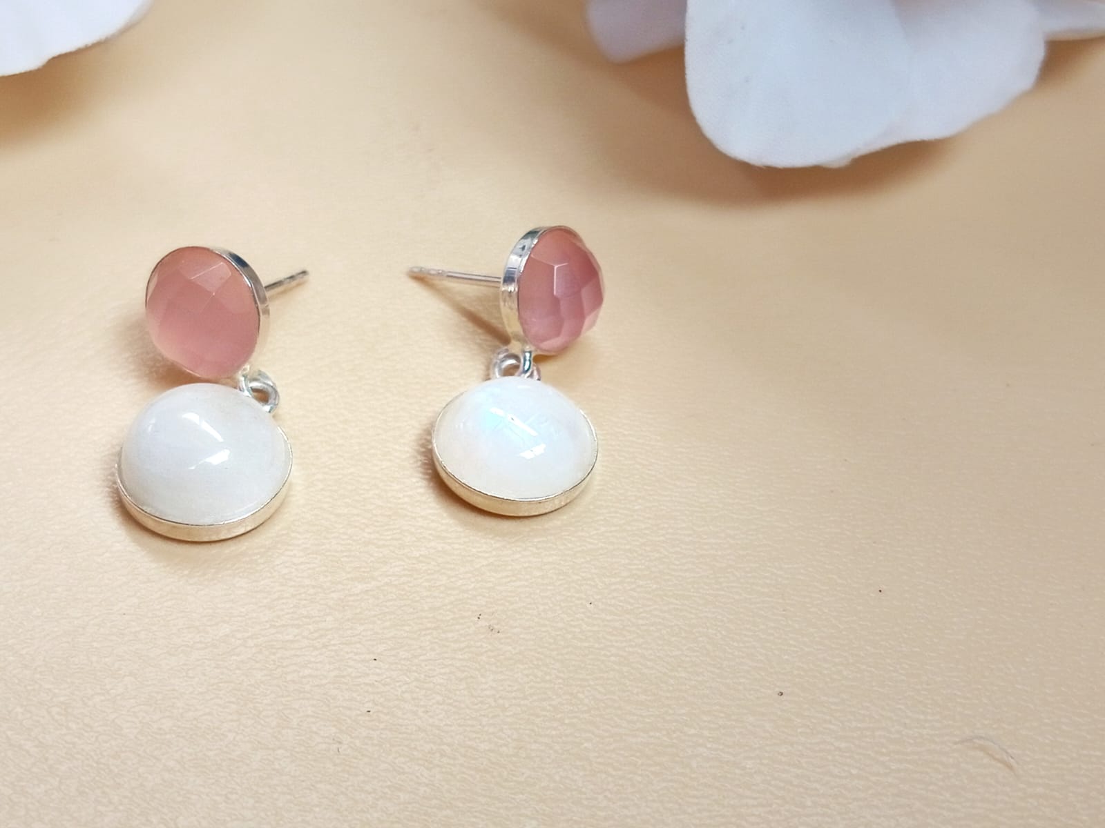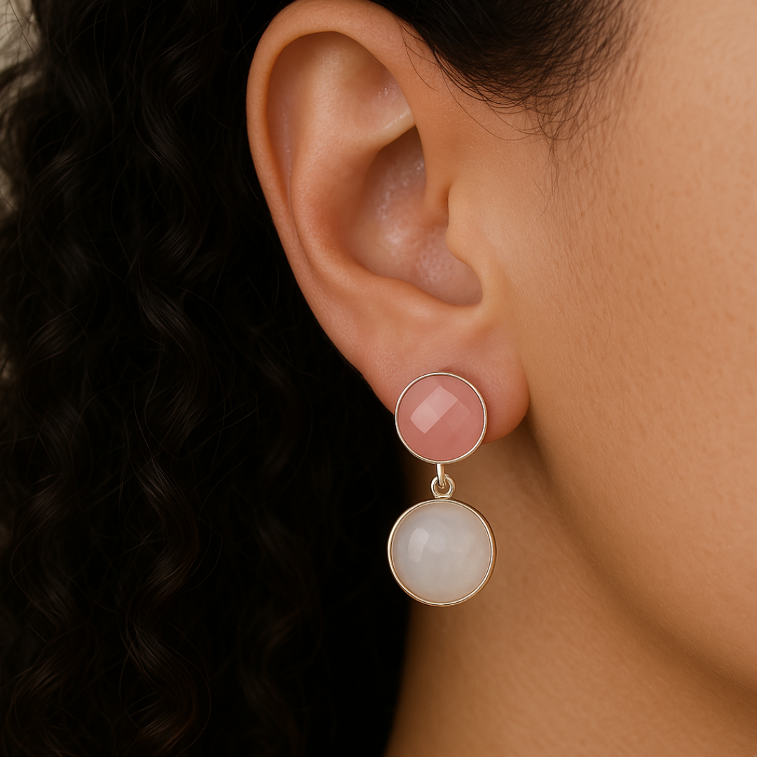 Aretes con Cuarzo rosa y Piedra luna para potenciar tu amor propio y energía intuitiva. Hechos a mano en Turquía en Plata 925.